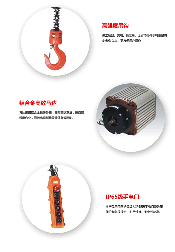 5、極限開關(guān):吊上吊下都有極限快關(guān)裝置,使電機(jī)自動停止,反防止鏈條超出,確保安全。