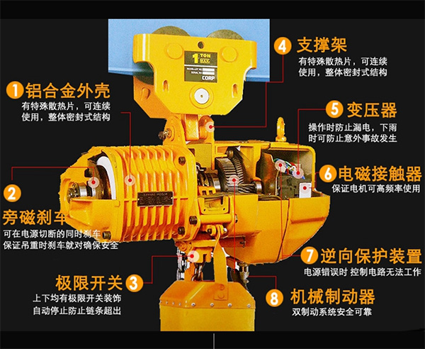 1、極限開(kāi)關(guān):吊上吊下都有極限開(kāi)關(guān)裝置,到達(dá)極限自動(dòng)停止,防止鏈條超出。