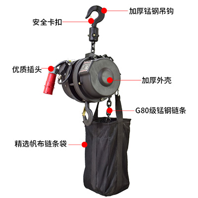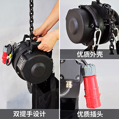 本款電動葫蘆專門為大型演出場合、吊裝燈光架、揚聲器組、大型布景裝置而設計的。也適用于其他臨時流動場合的起重,如:霓虹燈廣告立牌的安裝,小型建筑工地等。使用時只需將帶鉤的鏈條一端掛在上面梁上。而下面的葫蘆帶著被吊物體件一起順著鏈條向上爬行至預定的高度。